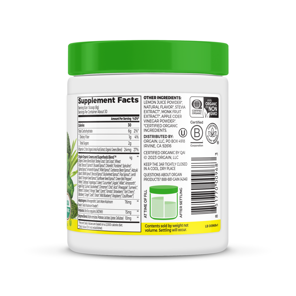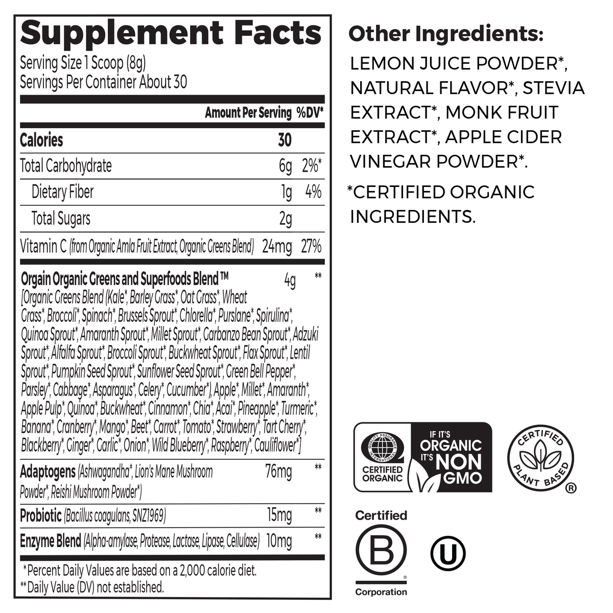 Our Organic Lemon Twist Flavored Supreme Greens Superfood Nutrition Powder is a smart and convenient way to supercharge your everyday nutrition and support gut health ++. Each serving contains 25 Organic Greens including purslane, kale, spinach, broccoli, chlorella, and more, and 50 organic, vegan superfoods. Our Supreme Greens Superfoods powder is certified organic, so you can rest assured that you are getting good, clean nutrition. Plus, each scoop contains 1 billion probiotics to support your digestive health++ and adaptogens ashwagandha, reishi, and lion¡¯s mane!